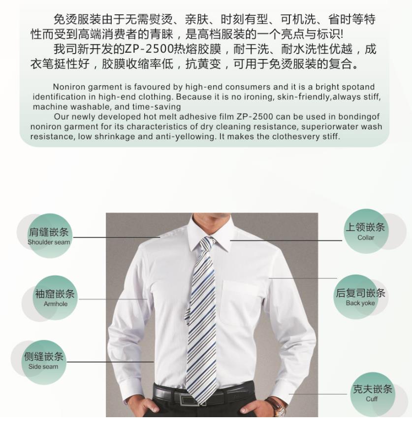 Penggunaan lapisan pemasangan film berperekat panas meleleh pada kerah dan manset pakaian secara bertahap menjadi pilihan yang lebih baik untuk kemeja tanpa besi kelas atas.